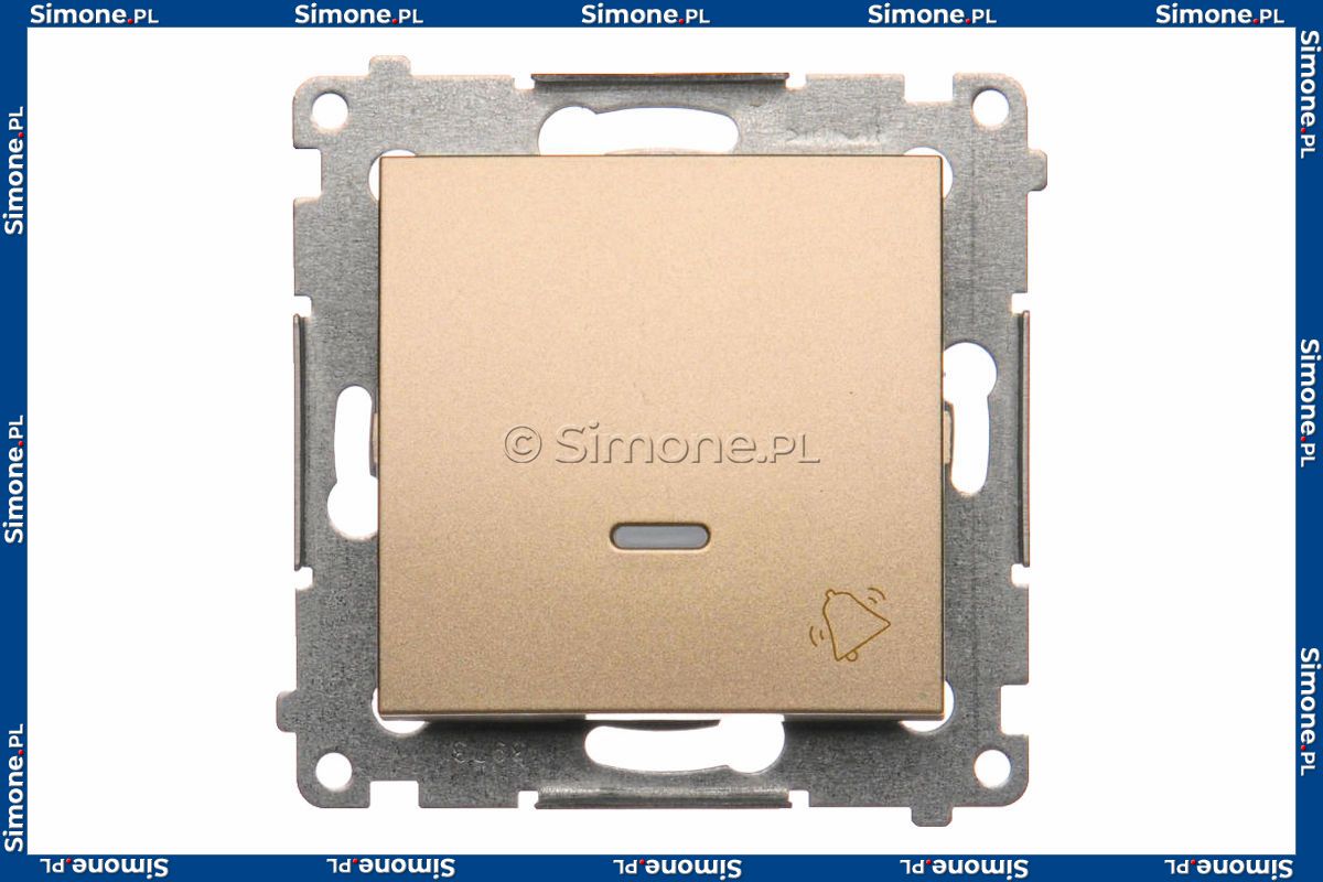 Przycisk dzwonkowy z podświetleniem typu LED w kolorze niebieskim 10A z serii Simon 54 w kolorze Złoty Mat o symbolu DD1L.01/44 zwany również przyciskiem chwilowym dokonuje krótkotrwałego połączenia obwodu. Produkt zaliczany jest do grupy łączników monostabilnych, co oznacza, że w swoim mechanizmie posiadają sprężynę, która po puszczeniu przycisku powoduje rozłączenie obwodu i jednoczesny powrót klawisza do pierwotnej pozycji.