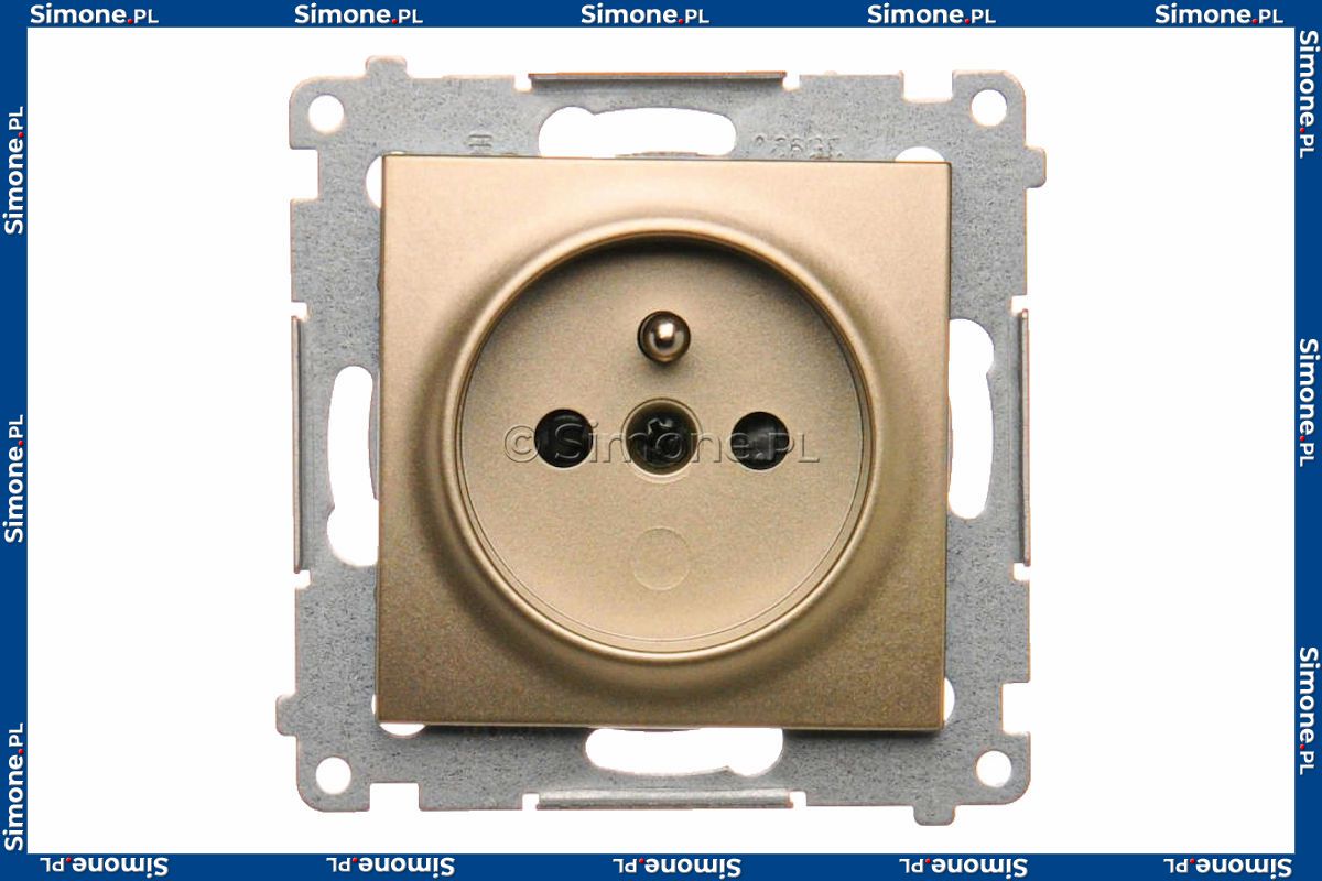 Gniazdo pojedyncze z bolcem uziemiającym i przesłoną torów prądowych z serii Simon 54 w kolorze Złoty Mat o symbolu DGZ1Z.01/44 to jedno z najpopularniejszych gniazd stosowane w instalacjach domowych i nie tylko. Produkt stanowią dwa otwory (na przewód fazowy i neutralny) oraz jeden bolec zwany również stykiem ochronnym umieszczony nad otworami.