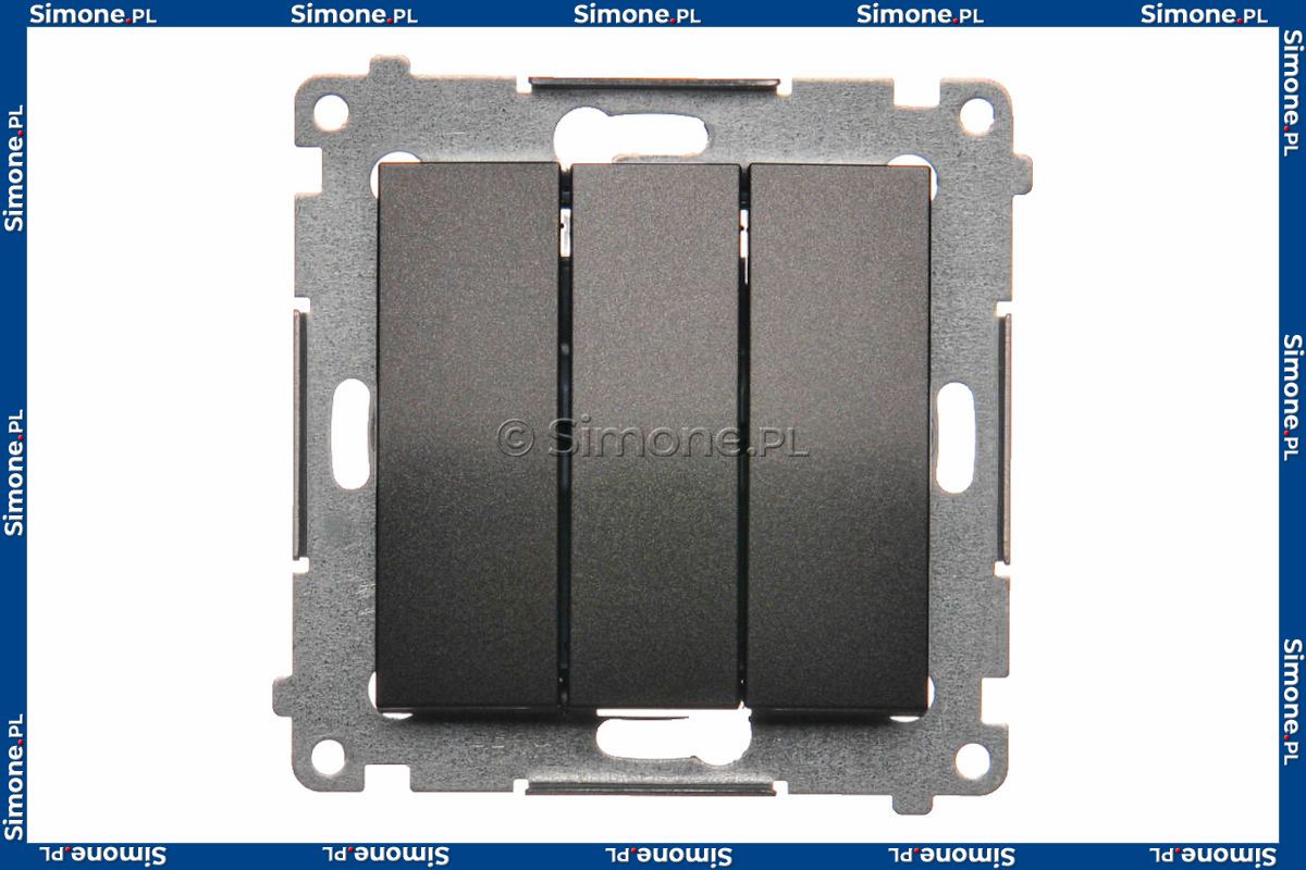 Przycisk zwierny potrójny 10A z serii Simon 54 w kolorze Antracyt o symbolu DP31.01/48 zwany również przyciskiem chwilowym dokonuje krótkotrwałego połączenia obwodu. Przycisk pojedynczy zwierny zaliczany jest do grupy łączników monostabilnych, co oznacza, że w swoim mechanizmie posiadają sprężynę, która po puszczeniu przycisku powoduje rozłączenie obwodu i jednoczesny powrót klawisza do pierwotnej pozycji.