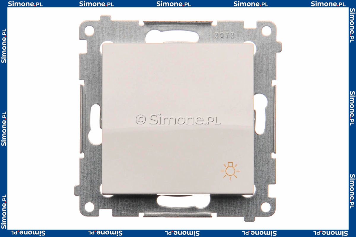 Przycisk zwierny z symbolem światła 10A z serii Simon 54 w kolorze Biały o symbolu DS1.01/11 zwany również przyciskiem chwilowym dokonuje krótkotrwałego połączenia obwodu. Produkt zaliczany jest do grupy łączników monostabilnych, co oznacza, że w swoim mechanizmie posiadają sprężynę, która po puszczeniu przycisku powoduje rozłączenie obwodu i jednoczesny powrót klawisza do pierwotnej pozycji.