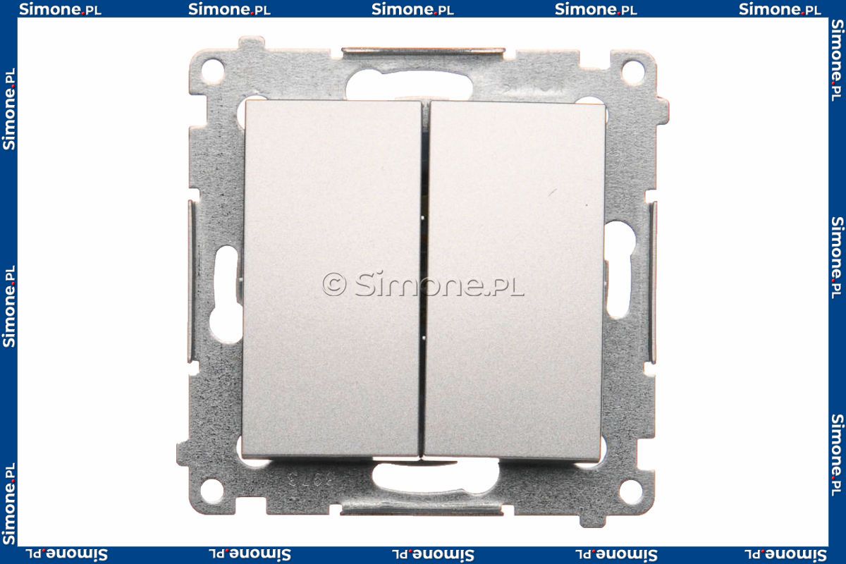 Łącznik podwójny 10A z serii Simon 54 w kolorze Srebrny Mat o symbolu DW5.01/43 zwany również łącznikiem świecznikowym lub szeregowym znajduje zastosowanie wszędzie tam, gdzie zachodzi potrzeba sterowania dwoma obwodami za pomocą jednego łącznika. Produkt wyposażony jest w dwa klawisze.