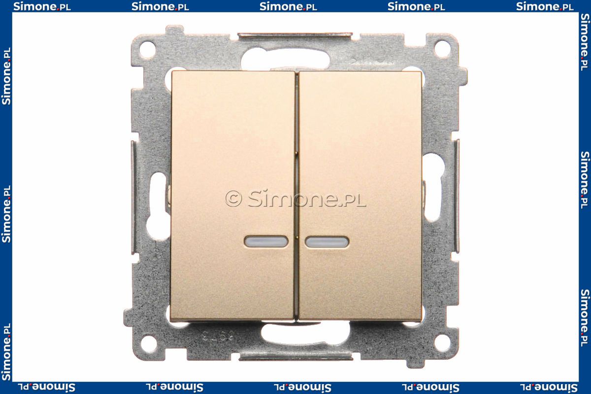 Łącznik podwójny do wersji IP44 z podświetleniem typu LED w kolorze niebieskim 10A z serii Simon 54 w kolorze Złoty Mat o symbolu DW5BL.01/44 zwany również łącznikiem świecznikowym lub szeregowym z podświetleniem znajduje zastosowanie wszędzie tam, gdzie zachodzi potrzeba sterowania dwoma niezależnymi obwodami za pomocą jednego łącznika. Produkt wyposażony jest w dwa klawisze.