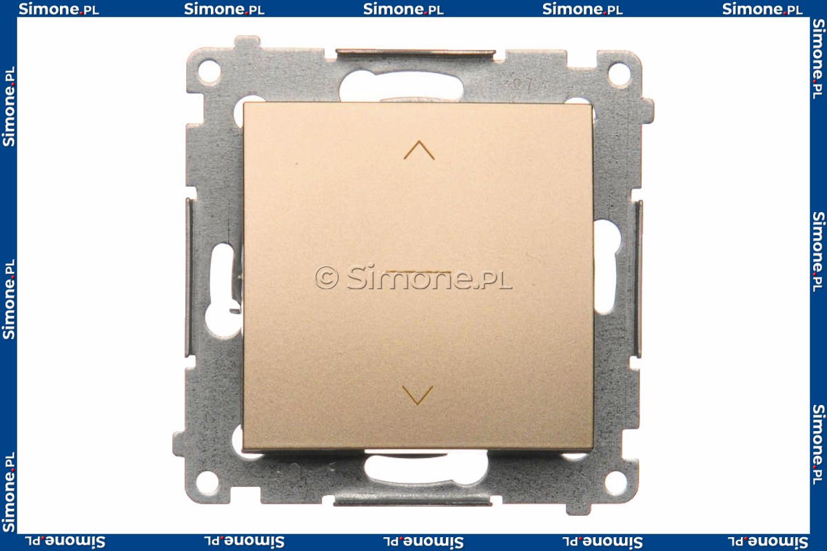 Łącznik żaluzjowy trójpozycyjny 1-0-2 10A z serii Simon 54 w kolorze złotym mat o symbolu DZW1K.01/44 przeznaczony jest do sterowania napędami żaluzji, rolet lub markiz w układzie góra–stop–dół. Produkt umożliwia precyzyjne i bezpieczne zarządzanie kierunkiem ruchu osłon okiennych z jednego punktu sterowania.