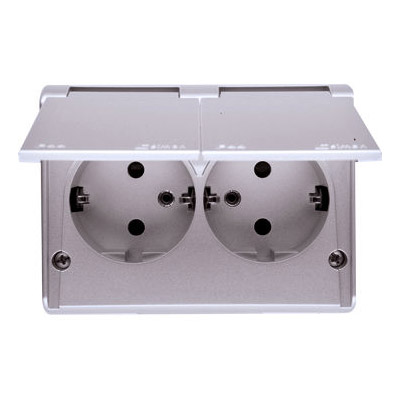 EGSZ2NZB/43 Gniazdo wtyczkowe podwójne z uziemieniem typu Schuko z przesłonami torów prądowych - w wersji IP44 - wersja skandynawska, (kompletny produkt), 16A, 250V, zaciski śrubowe, srebrny mat, metalizowany