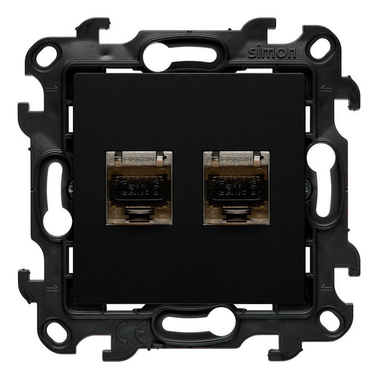 Gniazdo komputerowe podwójne RJ45 kat. 6 z serii Simon 24 marki Kontakt-Simon w kolorze czarnym mat o symbolu N62.01/49 przeznaczone jest do podłączenia sieci komputerowej w instalacjach teleinformatycznych. Produkt znajduje zastosowanie w instalacjach domowych oraz biurowych, zapewniając szybki i stabilny przesył danych.