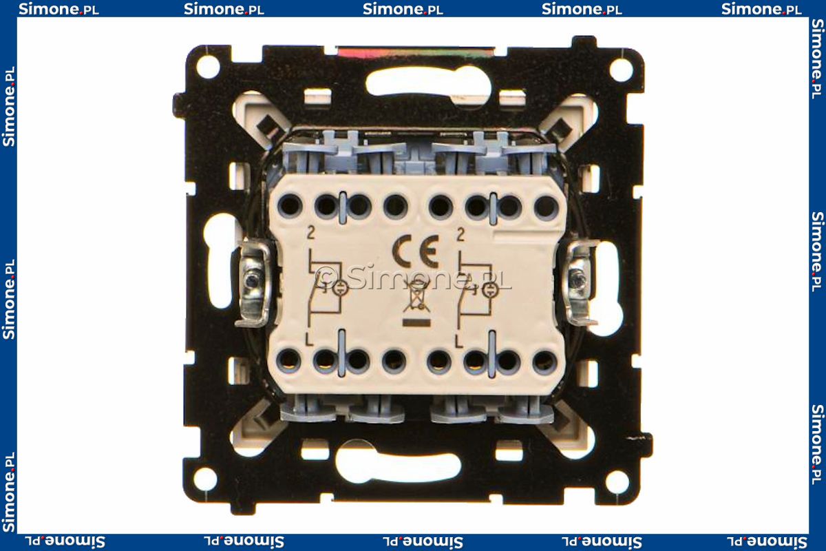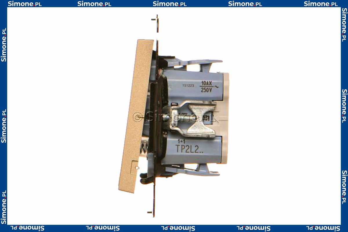TP2L2.01/144 Przycisk zwierny podwójny bez piktogramów z podświetleniem typu LED w kolorze białym 10A (osobne podświetlenie dla każdego klawisza) Szampański Mat Simon 55 - Widok z przodu